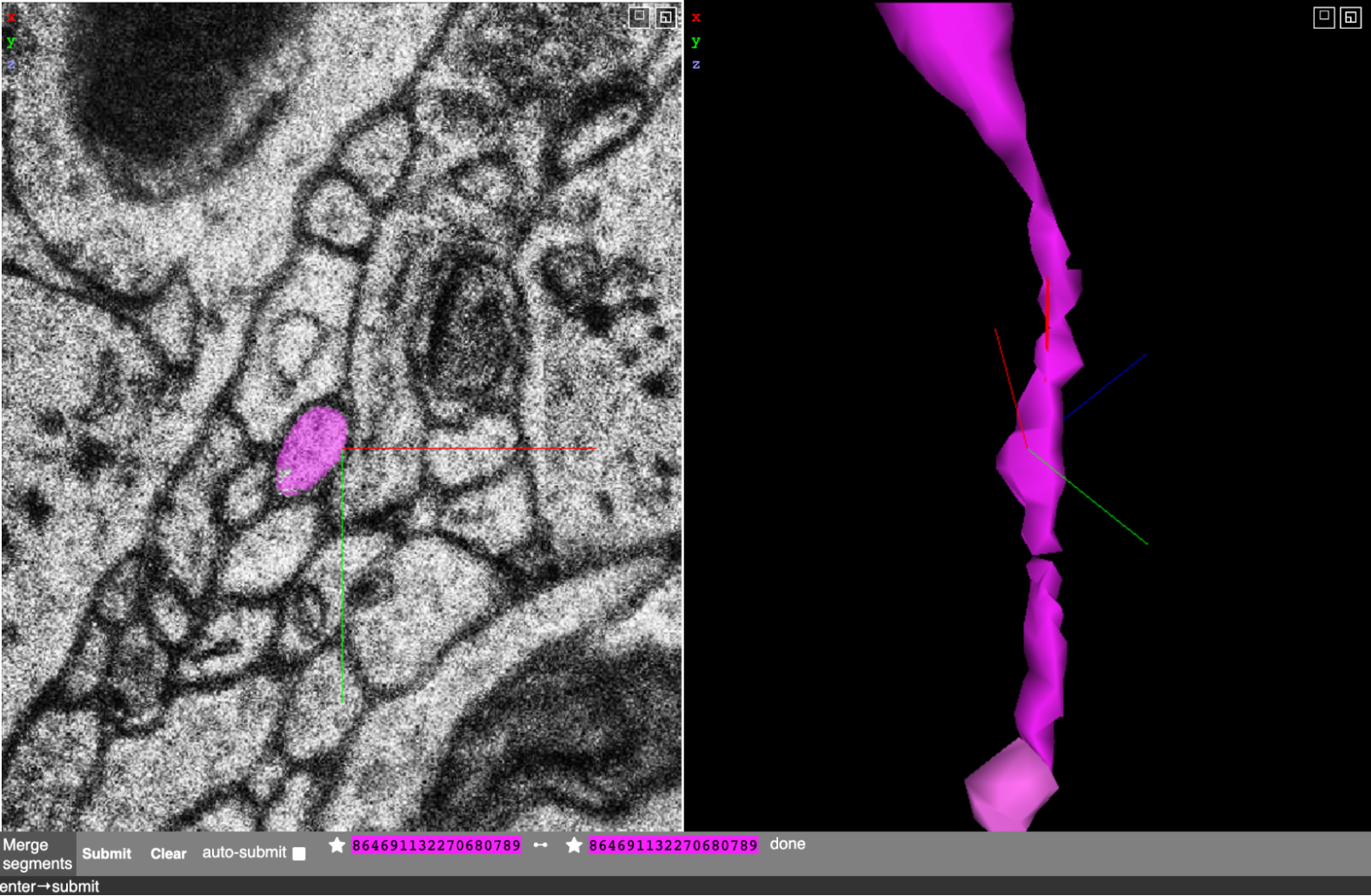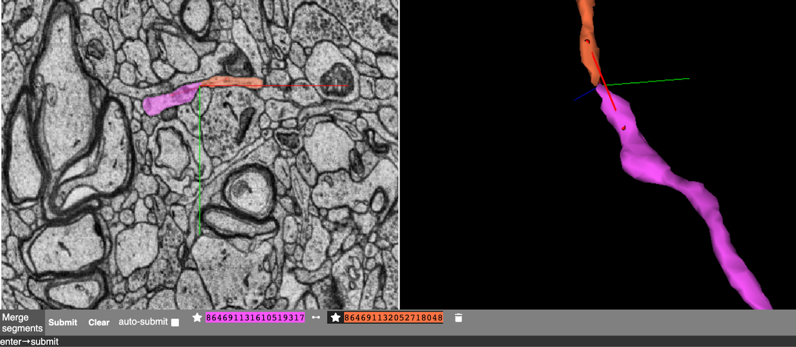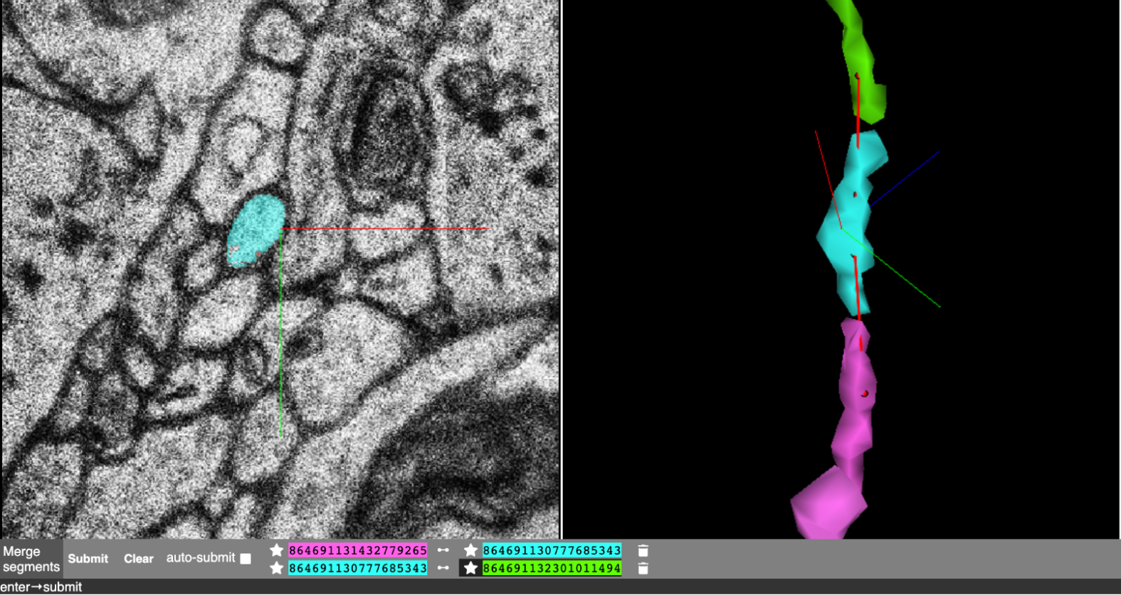 Proofreading in the Fish1.5 dataset is done in the same navigation link as above. Make edits only when confident—they’ll improve segmentation, you are contributing to a community effort. To get started here’s a quick guide on editing within Neuroglancer: